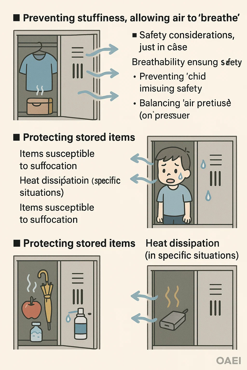 Isı dağıtımı (belirli durumlarda): Sıradan saklama dolapları buzdolabı olmasa da, ısı üreten eşyaları (yakın zamanda kullanılan bir taşınabilir şarj cihazı veya küçük cihazlar gibi) bir süreliğine içine koyarsanız, havalandırma delikleri ısının bir kısmının dağıtılmasına yardımcı olarak onu daha güvenli hale getirebilir.